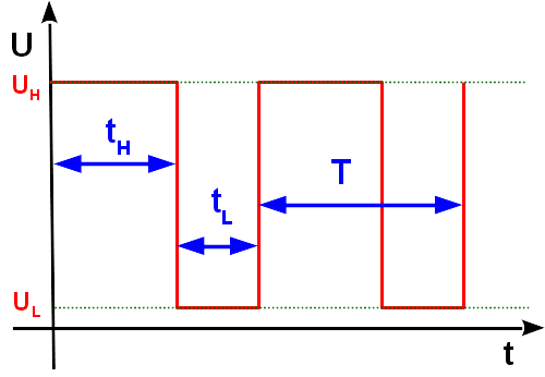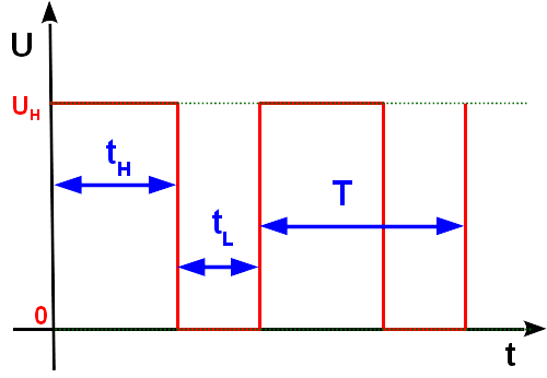Das Verhältnis von Einschaltdauer tH zur Periode T=tH+tL eines PWM-Signal wird als Tastgrad (engl: