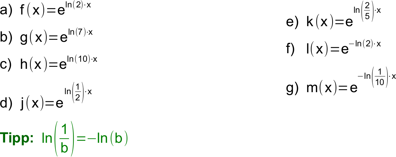 Gleichungen mit Exponentialfunktionen(Schwierigkeitsstufe i) Aufgabe i.8: Zeitaufwand: 10 Minuten Für a∈ℝ+ gilt: c⋅eln(a)∙x=c⋅a∙x denn eln(a)=a Für a∈ℝ+ und n∈ℝ gilt: ln(an)=n∙ln(a) Schreiben Sie die Funktionsterme als allgemeine Exponentialfunktion:
