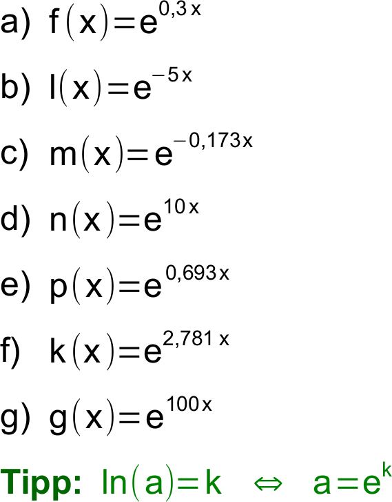Gleichungen mit Exponentialfunktionen(Schwierigkeitsstufe i) Aufgabe i.9: Zeitaufwand: 10 Minuten Für a∈ℝ+ gilt: c⋅eln(a)∙x=c⋅a∙x denn eln(a)=a Für a∈ℝ+ und n∈ℝ gilt: ln(an)=n∙ln(a) Schreiben Sie die Funktionsterme als allgemeine Exponentialfunktion. Runden Sie auf 3 signifikante Stellen.
